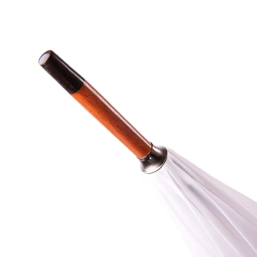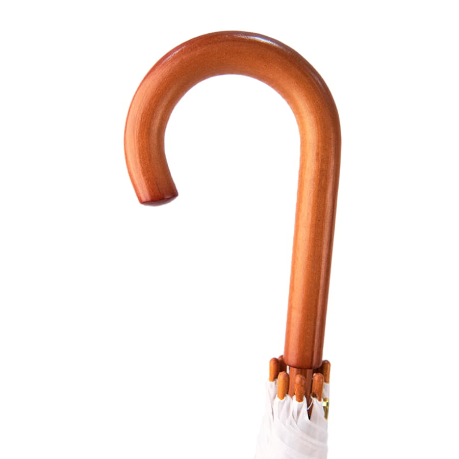 Зонт-трость, полуавтомат. Диаметр купола: 103 см., длина стержня 90 см. Состав купола: 100% полиэстер 190T Состав стержня: дерево. Состав спиц: металл. Ручка: дерево. Цвет купола: белый.
