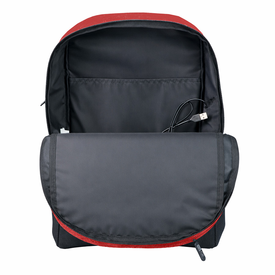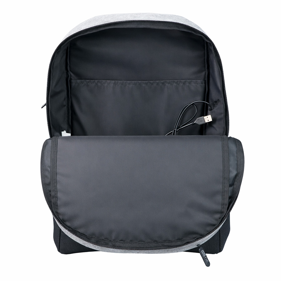 Рюкзак выполнен из 100% полиэстера верхняя часть 300 D, нижняя часть 600 D. Одно основное отделение на молнии, один внутренний карман с подкладкой для компьютера. Внутренняя подкладка из полиэстера 210D, один карман на молнии с лицевой стороны. Вентилируемые задняя деталь и ремни. Ремень для чемодана. Два сетчатых кармана для бутылок. Один USB-порт для мобильного телефона и кабель. Светоотражающие детали.Объём: 14 литров.